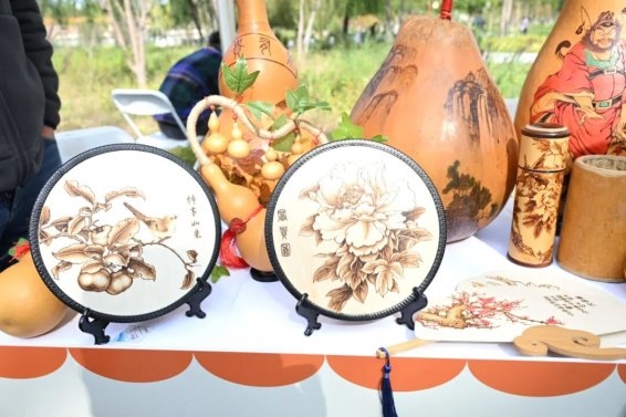 非遗文化体验区同样热闹非凡。火绘葫芦展示区观无虚席,不少家长带着孩子亲手体验传统火绘制作工艺。